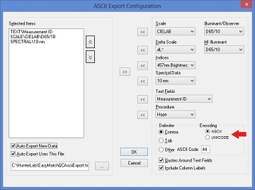 As of EasyMatch QC ver. 4.82 (Help/About), the Options/ASCII Export Configure was modified to include an option to encode output data in ASCII or Unicode. This is important for LIMs data collectors who need to know the data format in order to bring it in.